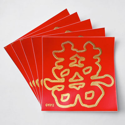 大きな喜喜文字が1つついた、真っ赤なシールです。周囲が金色に縁取られています。