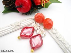コーラルオレンジのドイツカポションの下にはぷっくり可愛いメープルチェコリーフと赤のツイストヨーロピアンビーズが揺れる、クリスマスカラーの大人可愛いピアス・イヤリングです。ヨーロッパのビーズは発色や形が綺麗で素敵です。
