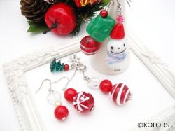 クリスマスカラーのトンボ玉で5種類のピアスをデザインしました。日替わりで左右の耳に好きなピアスを着けてオシャレが楽しめます。スワロフスキーで作成した小さなクリスマスツリーチャームをお付けしました。お手持ちのアクセサリーやポーチのファスナーなどに着けて楽しめます。