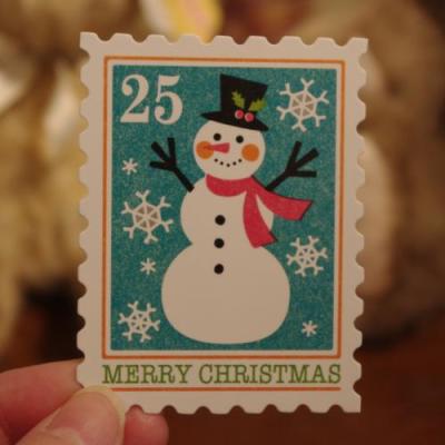 ちょっとしたメッセージを書くのにピッタリな雪だるまの絵柄のスタンプ型のクリスマスカードです。封筒がついた3枚セットです。