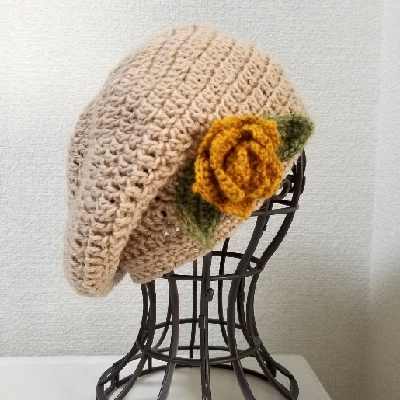 帽子本体色はベージュ系でバラは黄土色、葉っぱはグリーン系です。