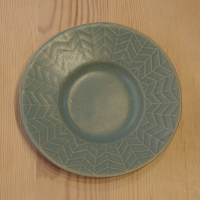 ちょっと大きめのリム部分に杉の葉をイメージした模様 シダーパターン を施した小皿です。色は「ブルーグレー」。サイズ:外径17.5×内径9×高さ3cm よしざわ窯 陶器 益子焼 日本製