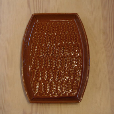 「樽」の形をモチーフにした食器。「木つながり」で、樽(トノー)型モチーフの大きさお皿に森の模様を入れて製作したのが「あめ色 森のトノー皿」です。サイズ:たて28×よこ20×高さ2cm よしざわ窯 陶器 益子焼 日本製