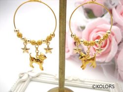 小さな犬と星が耳元でユラユラ揺れるフープピアスです。ゴールドのスターダストメタルパールでゴージャス感をプラスしました。2018年の干支の「戌」の縁起物アクセサリーです。限定販売です。