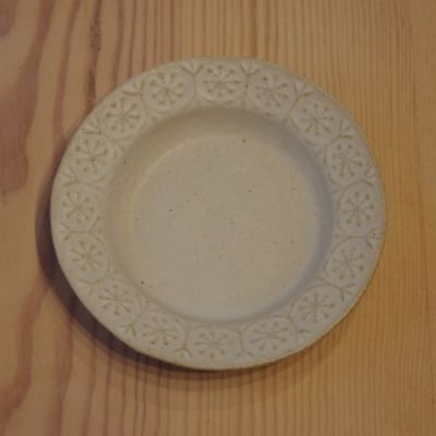 ヨーロッパの庭の風景をイメージしたフラワーの模様をリムに施した小皿です。模様の部分は凹凸があります。色は「ホワイト」で仕上げました。サイズ:径11cm×高さ2.5cm よしざわ窯 陶器 益子焼 日本製
