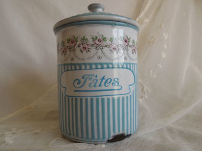 フランスより届いた超レア☆BB社のローズバンドホーロー キャニスター"Pates"(パスタ)。