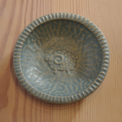ツヤのない、スモーキーな水色の器です。中央に立体的な「ひつじ」がいます。サイズ:Φ11.5cm×高さ2.5cm よしざわ窯 陶器 益子焼 日本製