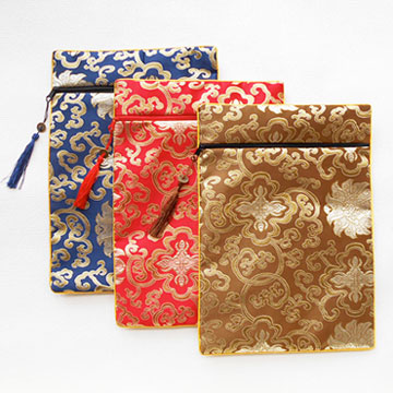 フェイク古銭と房がついた、チャイナ生地のA4ケースです。書類入れにしたり、旅行用に着替えなどを入れたり、その他小物の整理など、色々使えそうです。縦33×横24cm