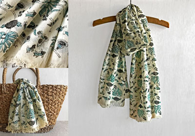 ブロックプリントが素敵なオーガニックコットンストール。オーガニックコットンを手織りしてつくられています。ナチュラルな色合いと繊細な蓮柄がとても印象的。