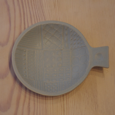 カッティングボードの形をモチーフにしたお皿です。表面に入れた模様は寄木細工をイメージしています。サイズ:Φ13cm(器部分)×高さ2.5cm(*持ち手を含めた長さ…15.5cm)よしざわ窯 陶器 益子焼 日本製