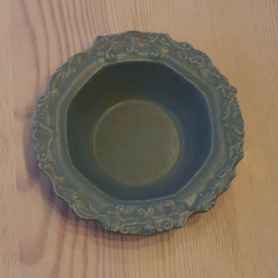 中世のヨーロッパ貴族が愛用していた「銀食器」をモチーフにした器です。「銀食器」特有の繊細な模様を、縁に施しました。色は青錆釉をかけました。サイズ:外Φ15.5cm(内Φ10.5〜11cm)×高さ4cm よしざわ窯 陶器 益子焼 日本製