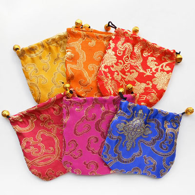 ヒモの先に金色のプラスチックビーズがついた、小さな巾着袋です。裏地がついているためか、ほんの少しふんわり感があります。この裏地はすべて、青い綿素材です。縦9.5〜10.5×横10〜11cm