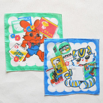 勉強熱心なネコとウサギの図案がついた、レトロハンカチです。全体的に、あまりきれいなプリントではありません。約25×25cm