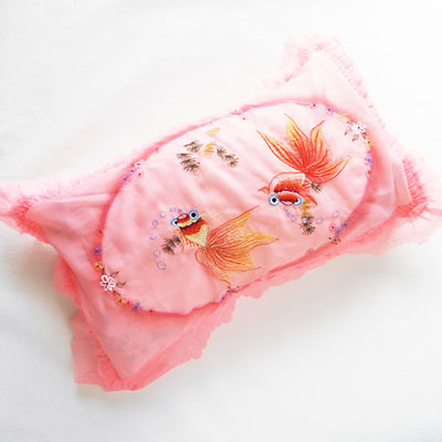 シースルー地に金魚の刺繍がほどこされた、ピンク色の枕カバーです。すべてミシン刺繍ですが、手刺繍のような味わいがあります。ところどころ難ありです。全体:縦46×横72cm、枕の入る部分:縦34×横61cm