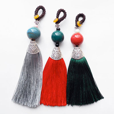 大きな丸玉がついた、チャイナテイストのきれいなタッセル飾りです。上部の黄色いボタンを外して、キーホルダーのように使用できます。全長約13cm、丸玉直径約1.8cm、房の長さ約6.5〜7cm