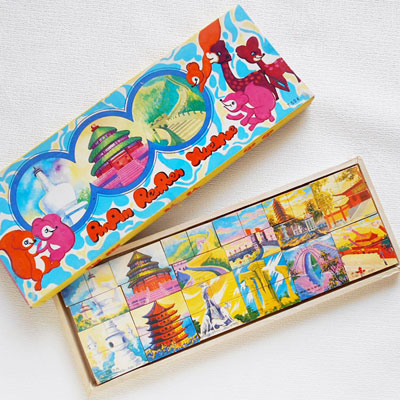 中国の観光名所の絵がついた、積み木のような作りのパズルです。反対面にはピンインがついています。コマは、木片に紙を貼っただけの、簡素で素朴な作りです。箱:縦13.5×横38×高さ2cm
