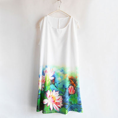 ほわんと描かれたロータス柄の、ノースリーブチュニックです。つるっとした肌触りで、伸縮するポリエステル生地です。フリーサイズ。