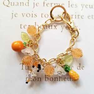 キャンディビーズ、白いお花のビーズ、フルーツチャームをぶら下げたバックチャームです。