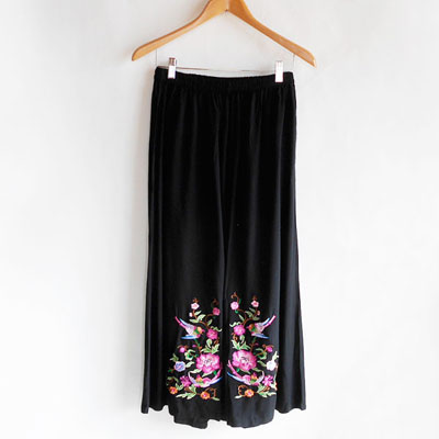 両すそにきれいな花鳥刺繍がついた、ブラックワイドパンツです。ウエストゴムのフリーサイズで、動きやすく、楽ちんなはき心地です。