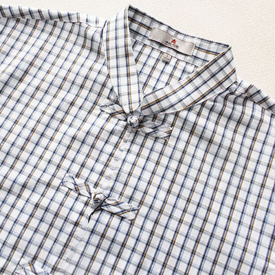 涼しげなチェック柄の、メンズ半袖チャイナシャツです。少しハリがあり、なめらかな肌触りの綿素材です。中国ものにしては縫製は丁寧で、品質良好だと思います。