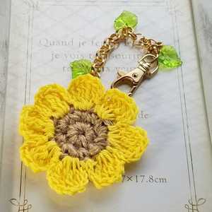 麻糸とコットンで編んだひまわりのモチーフのバックチャームになります。