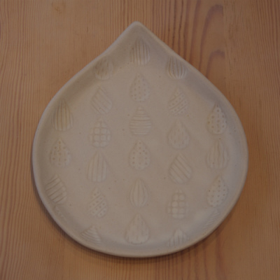 しずくの形をした大皿です。全体に色々な柄のしずく模様が施されていて楽しい感じの器です。色はツヤのないホワイト。サイズ:たて24.5×よこ21×高さ3cm よしざわ窯 陶器 益子焼 日本製