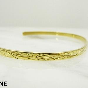 18金ゴールドの細身のボディに繊細に細工されたバングルが身につける人をより一層引き立ててくれます。