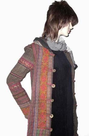 商品紹介: 古銭ボタンがズラッと並んだフードのコート、モン族です。両脇ポケット、裾がわずか広いストレートのデザインでスリットがあります。パンツよし、スカートよしの厚地で暖かコートです。