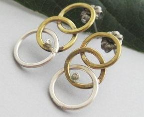 商品紹介: シルバーとブラス(真鍮)の輪っかを組み合わせたハンドメイドピアスです。小さな小さなクリスタライズがキラリと輝きます。ハンドメイドだからこそのユニークなデザイン、1点限りの入荷です。ネックレスやデザイン違いもございます。