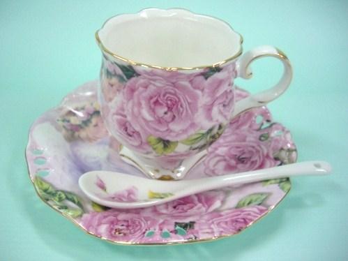 商品紹介: 可愛い天使とゴージャスな薔薇が描かれた、カップとソーサー、スプーンの3点セットです♪