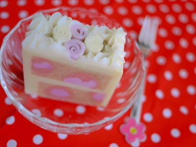 商品紹介: 精製水の代わりに3分の2ほどを、牛乳に代えた生地と、豆乳に代えた生地でケーキを作りました。スポンジがずれてしまったけどスポンジ部分は牛乳。周りのクリームは豆乳。