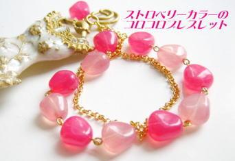 商品紹介: 小石みたいな不ぞろいな形のストロベリーカラーチェコビーズのブレスレット。これからの暑い季節にぴったりの爽やかカラーのジャラジャラブレスレット。