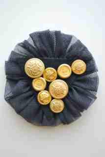 商品紹介: きんきらのボタンが印象的なコサージュ。