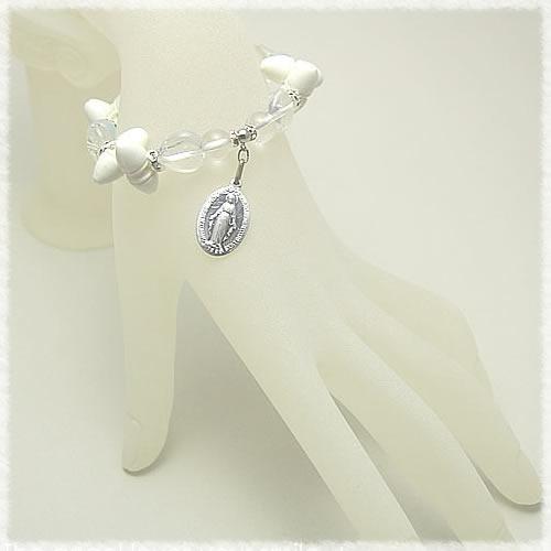 商品紹介: 白色が可愛いヴィンテージビーズ(フランス)とアクアマリンに奇跡のメダイが涼しげな優しい印象のブレスレットです。