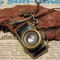 商品紹介: 本物そっくりの小さなカメラがついたレザーネックレス♪小さなエッフェル塔や四葉のクローバーもついていてかわいいです☆