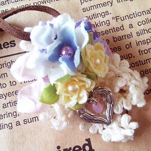 商品紹介: 小ぶりの造花とレース、チロルリボンを使ったカジュアルなコサージュブローチです。ブーケの下には天使の羽根でハートをかたどったチャームを下げました。
