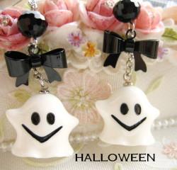 商品紹介: 愛くるしいフェイスのゴーストチャームのピアス・イヤリングです。ブラックリボンとカットガラスをプラスしてハロウィーンカラーのアクセにしました。