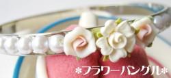商品紹介: クリスマスシーズンに大活躍しそうなエレガントなバングルです。ホワイトフラワーに合わせてバングル前周にパールをデコレーションしました。別売りのバングルと重ね付けするとゴージャス感がプラスされます。