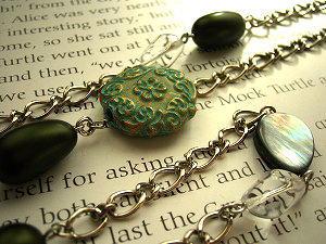 黒蝶貝のコイン型ビーズやクリアビーズも繋ぎ、軽やかな色と質感です。個性のあるビーズに合わせて、太めのチェーン使用です。胸元にくる彫のあるビーズ(直径2cm)がポイントです♪(裏表同じ)