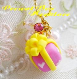 商品紹介: プレゼントボックスチャームのプリティーネックレス。パールとガラスビーズをじゃらじゃらさせてよりプリティーに仕上げました。アクセントとして一粒ローズストーンを輝かせました。