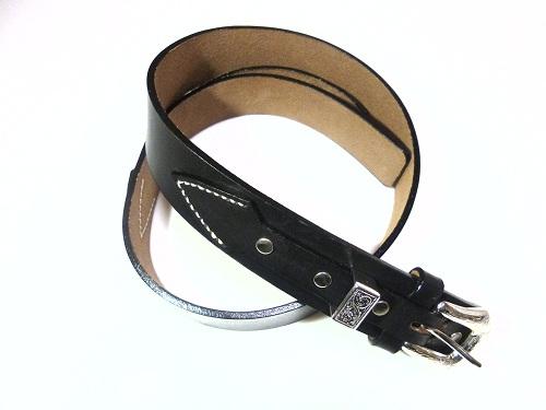 バックルの後ろ側に太いベルトの先端を差し込んで細い先端はバックルに通します。あえてアイボリーの糸で縫いとめてありますが・・お好みで!