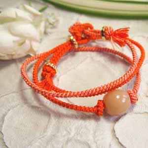商品紹介: ころりん丸いピンクのグラスビーズをセンターに通した紐を3重巻きにしてつけるタイプです。1本の紐の半分からカラーを切り替えることで、ピンク・オレンジの2色カラーのブレスレットになりました。 (他全5色あり)