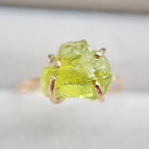 商品紹介: 爽やかなグリーンが目を引く ペリドット原石をシンプルに爪留めした指輪です。
