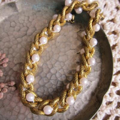 商品紹介: ハンドメイドアクセサリー『kanakana』さんのvintageブラスチェーンブレスレットです。表面に細かな模様の入ったブラスチェーンに4mmのアクリルパールが糸で絡めてあります。装着すると、存在感ありとってもすてきです!