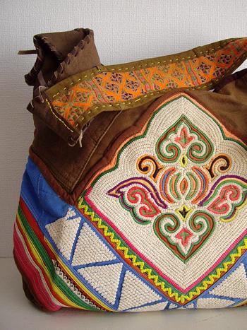 商品紹介: 白モン族のコード刺繍とアップリケが素晴らしい古布と、天然レザーを組み合わせた、