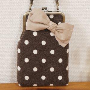 商品紹介: 水玉のコットンネル生地でつくったがまぐちのスマートフォンケース。もちて部分は取り外しできるのでお手持ちのバッグなどにぶら下げても使えます。