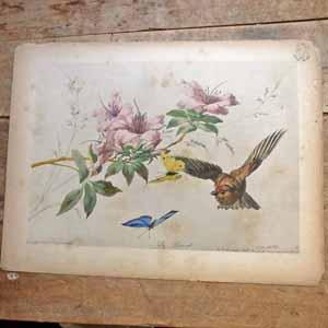 商品紹介: パリの有名な出版人 Armand Guerinet(彼の出版物は博物館、美術館などでも見ることができます)が出した植物&小鳥のプリント画。 とても素敵なモチーフです。 蔵書印があることから、ブルジョア階級以上のご家庭のコレクションだったのだと思います。 古いものなので紙の切れ、変色があります。