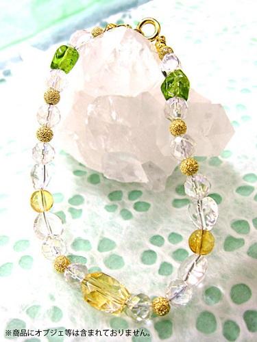 商品紹介: 黄色の石は金運・コミュニケーションの意味を持つシトリン、成功の意味を持つグリーンの石はペリドット。そして、64面カットのホワイトオーラに、ハートカットの水晶は、全ての石のパワーアップのために使用しました。