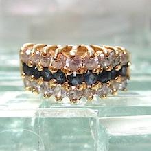 商品紹介: K14ゴールドプレート、クリアラインストーンとサファイヤブルーラインストーンのリングです。上品でエレガントな雰囲気です。新品同様です。1970年代製。