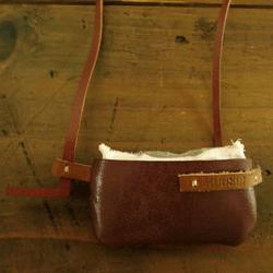 商品紹介: やや横長の渋革袋に刻印革を縫いつけ、